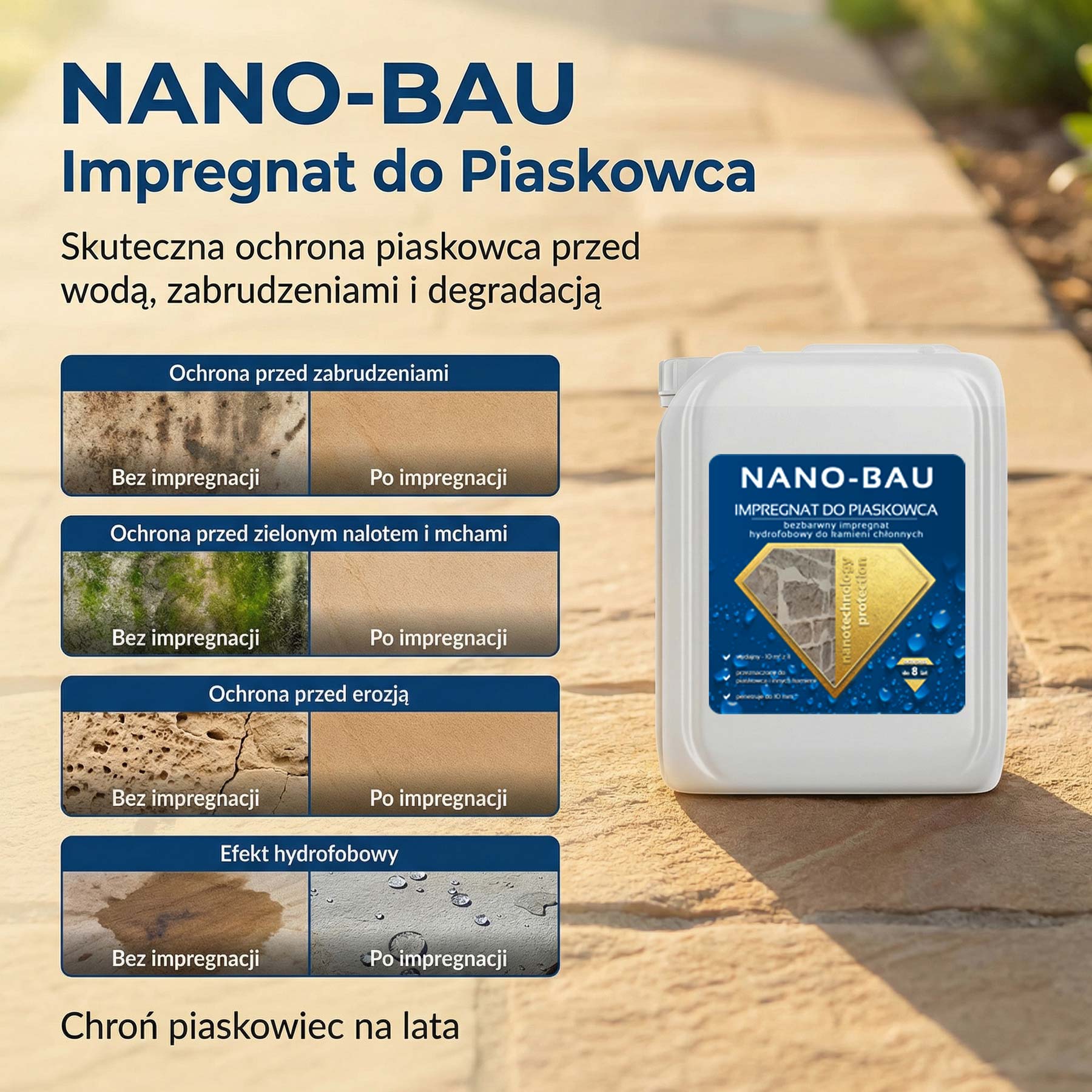 | Jaki impregnat do piaskowca na taras wybrać, żeby nie chłonął wody i brudu? | Jeśli zależy Ci na ochronie bez zmiany wyglądu, wybierz NANO-BAU bezbarwny impregnat do piaskowca, który tworzy hydrofobową barierę i ogranicza wnikanie wilgoci oraz zabrudzeń. |