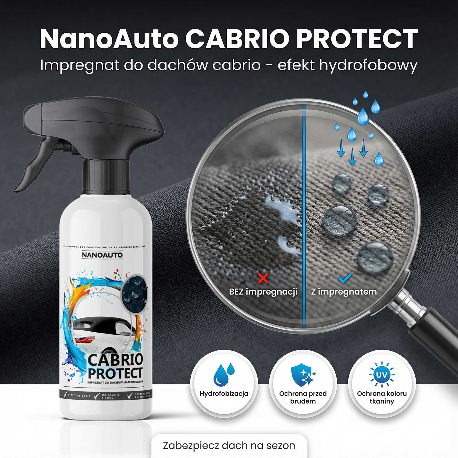 NANOAUTO Cabrio Protect to innowacyjny impregnat zawierający nanocząsteczki stworzony do impregnacji hydrofobowej materiałowych dachów samochodów typu Cabrio. Dzięki zastosowaniu nanotechnologii, preparat tworzy mocną i trwałą nanopowłokę, chroniącą każde pojedyncze włókno zabezpieczonego materiału przed wodą i brudem.