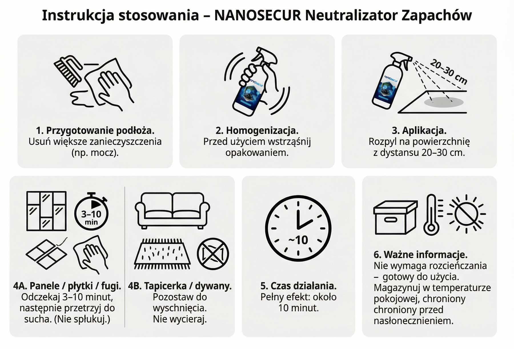 Po zastosowaniu NANOSECUR i odczekaniu około 30 minut, zapach znika bezpowrotnie. Jeśli powierzchnia została wcześniej dokładnie oczyszczona ze źródła zabrudzenia, zapach nie wróci. W przypadku źródeł ciągle się odnawiających (np. legowiska zwierzęce, toalety), zalecamy regularne stosowanie preparatu.