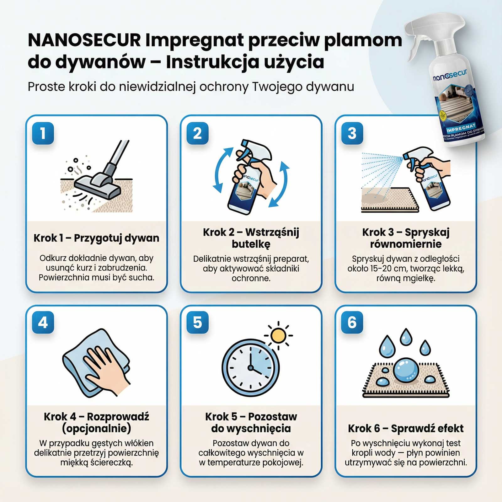4) Jak pozbyć się nieprzyjemnych zapachów z dywanu? Najpierw usuń źródło zapachu (zalanie, zabrudzenie organiczne) i dokładnie wysusz dywan. Impregnat NANOSECUR działa głównie ochronnie – pomaga ograniczać wnikanie cieczy (profilaktyka), ale nie zastępuje preparatu do neutralizacji zapachu.