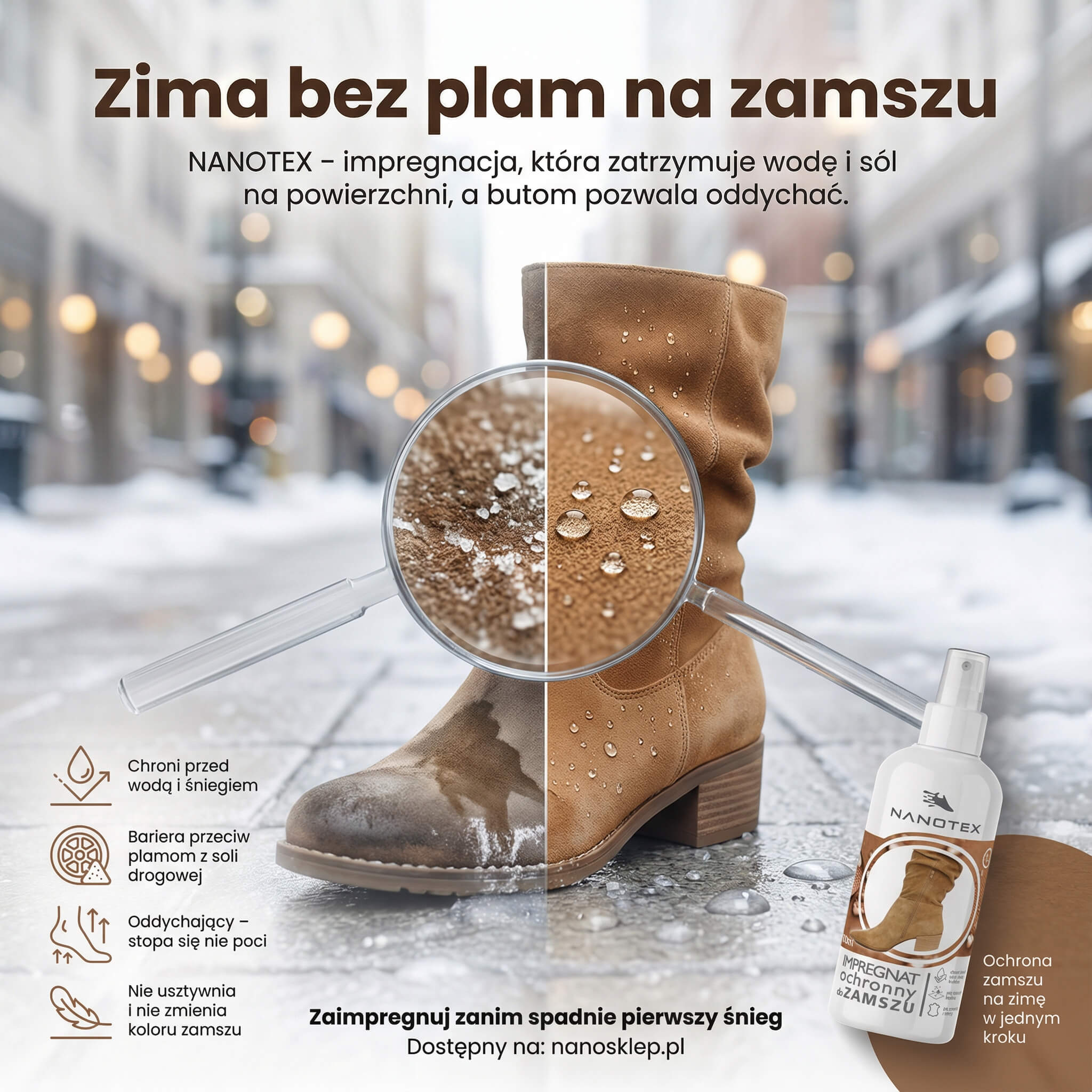 NanoTex do impregnacji zamszu i nubuku to innowacyjny produkt stworzony w celu skutecznej ochrony butów z zamszu, nubuku i skóry nielakierowanej, silnie hydrofobizując obuwie, aby woda deszczowa i błoto nie penetrowały do ich wnętrza. Regularne stosowanie impregnatu zapewnia kompleksową ochronę przed zabrudzeniami, solą i plamami, a jednocześnie nie osłabia koloru ani nie natłuszcza materiału, co sprawia, że buty pozostają czyste, suche i zachowują świeży wygląd.