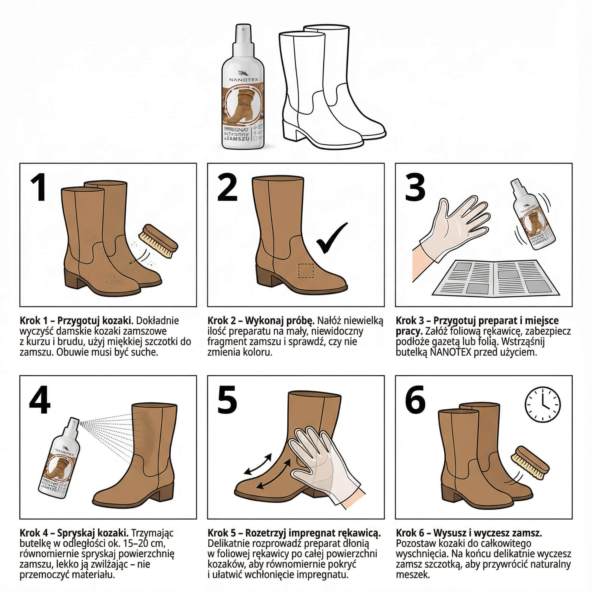 Nie tylko buty zamszowe, ale również buty nubukowe i ze skóry naturalnej mogą być z powodzeniem zabezpieczone impregnatem NANOTEX. Regularne stosowanie tego produktu gwarantuje długotrwałą ochronę, niezależnie od warunków pogodowych.