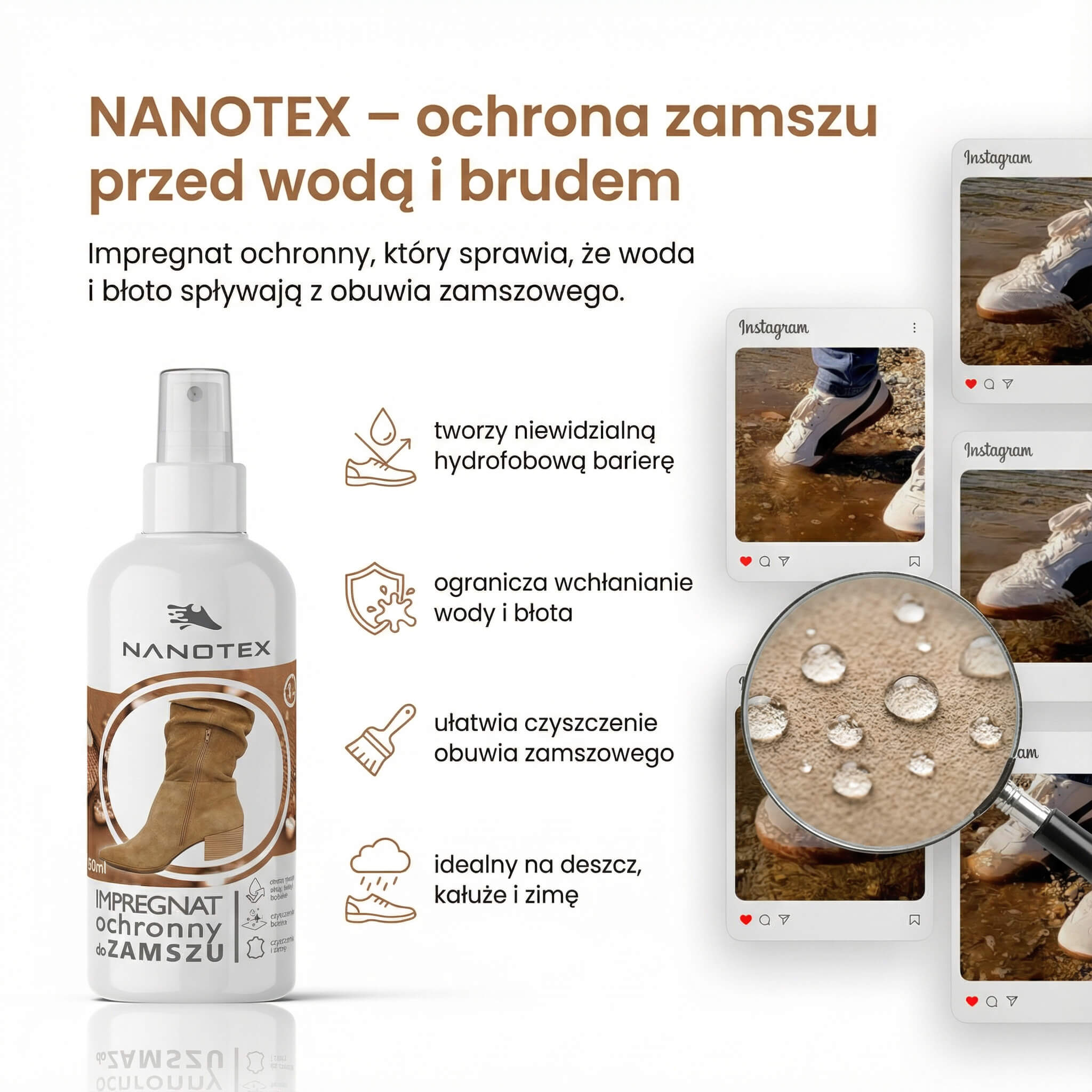 NANOTEX to specjalnie opracowany produkt, stworzony w celu ochrony butów z zamszu, nubuku i skóry naturalnej. Dzięki jego zastosowaniu obuwie jest skutecznie zabezpieczone przed wodą deszczową, błotem oraz innymi zabrudzeniami. Impregnat NANOTEX cechuje się wysoką hydrofobowością, co oznacza, że woda i inne płyny nie mają możliwości wnikać do wnętrza butów. Dzięki temu, użytkownik może cieszyć się suchymi i czystymi stopami nawet w najbardziej deszczowe dni.