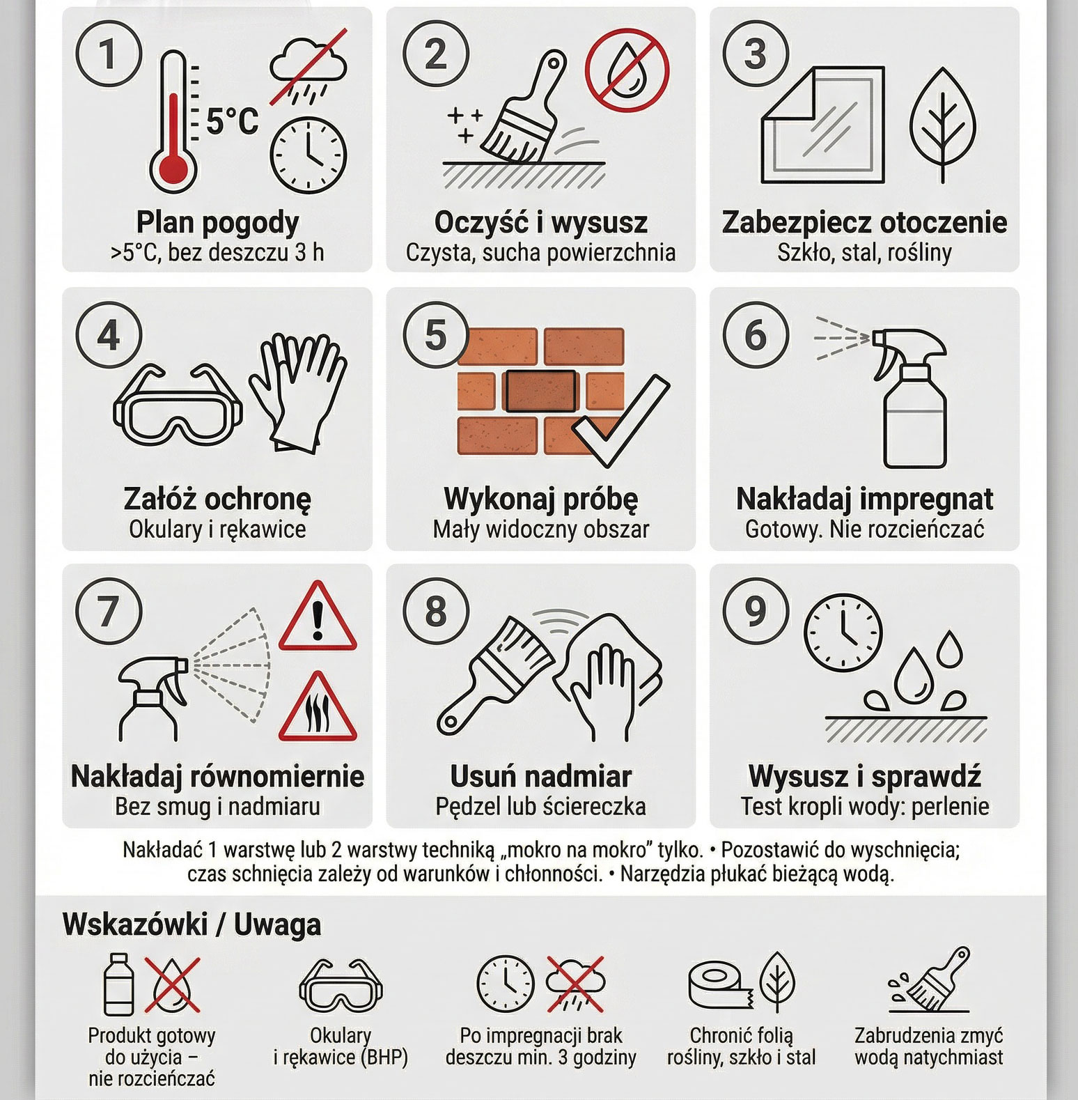 | Czy produkt zmienia kolor cegły lub klinkieru? | Jest bezbarwny. Może delikatnie zmienić odbiór powierzchni zależnie od porowatości – dlatego zawsze wykonaj próbę na małym, mało widocznym fragmencie. |