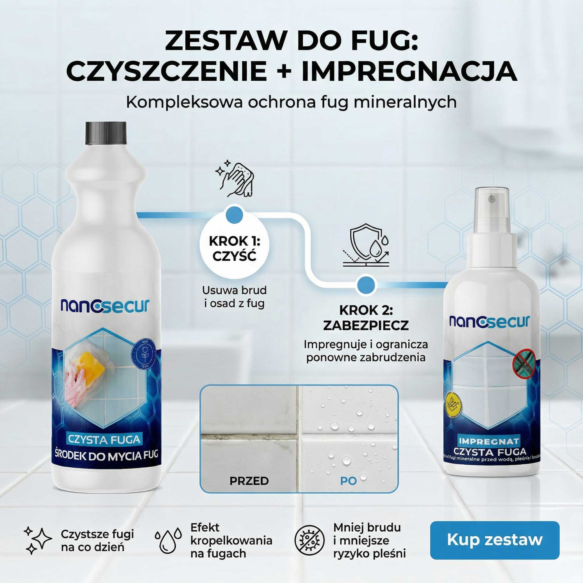 Zestaw NanoSecur to praktyczne rozwiązanie dla osób, które chcą jednocześnie uzyskać efekt „odświeżonych” spoin oraz zabezpieczyć je na przyszłość. Najpierw doczyszczasz fugi środkiem NanoSecur Czysta Fuga 1 L, a następnie wykonujesz impregnację fug mineralnych i cementowych produktem NanoSecur Impregnat do fug 100 ml. Taki schemat (czyszczenie → wyschnięcie → impregnacja) jest kluczowy, bo impregnat działa najlepiej na fugach czystych i całkowicie suchych.