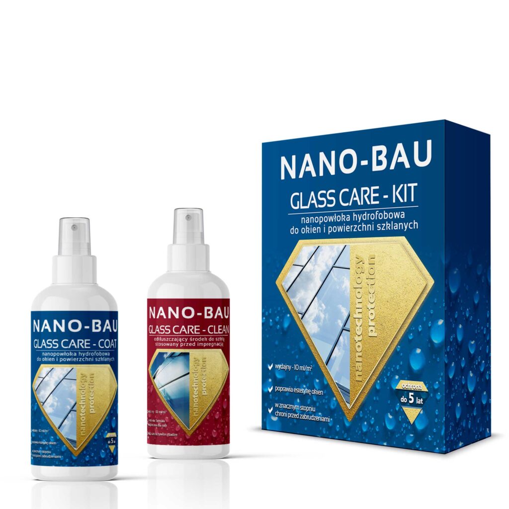 NANOBAU GLASS Care Kit to kompleksowy zestaw do trwałego na lata zabezpieczania i impregnacji okien, elewacji szklanych, szklarni, oranżerii i innych powierzchni wykonanych z szkła.